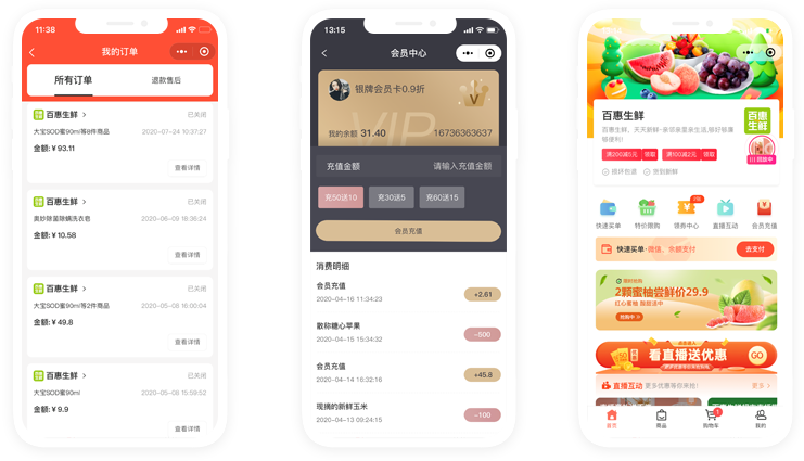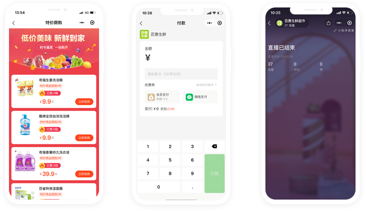 会员营销,快速买单,直播营销,特价活动等丰富的营销方案,帮助商家拉新、转化、复购、裂变。
