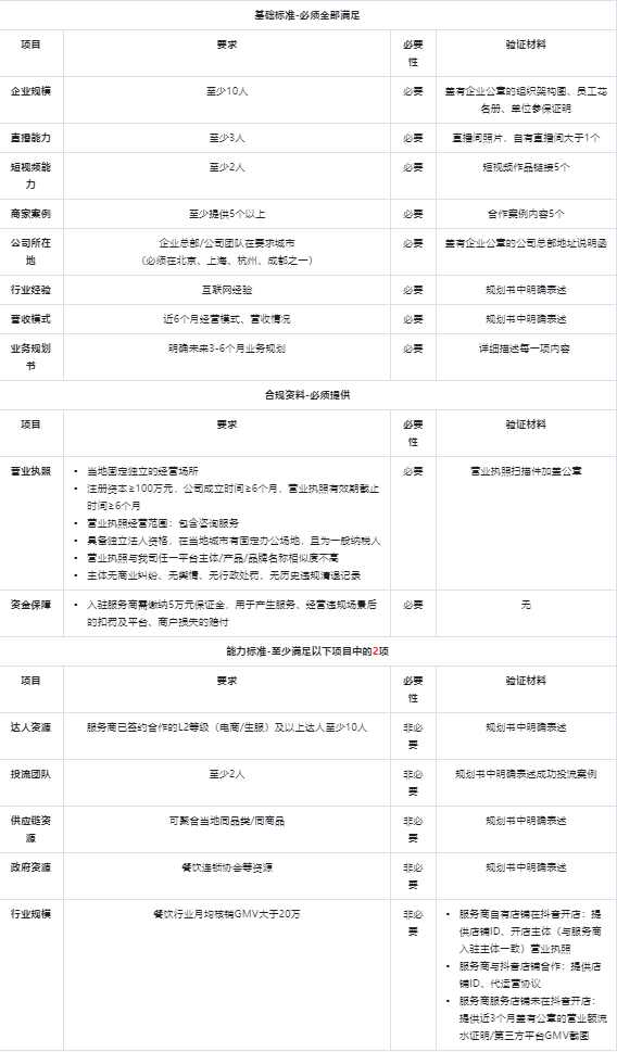 至于具体是哪些资源,则是由平台自己来定。拿当前风头正盛的抖音和它今年频繁更新的外卖业务来说,它就在之前发布的关于新增《【到家外卖】内容服务商开放准入公告》的公示通知中要求了,递交申请的企业主体必须具备已签约合作的L2等级(电商/生服)及以上达人至少10人的达人资源、至少2人的投流团队、可聚合当地同品类/同商品的供应链资源和餐饮连锁协会等政府资源以及餐饮行业月均核销GMV大于20万的行业规模5项规则中的至少2项。