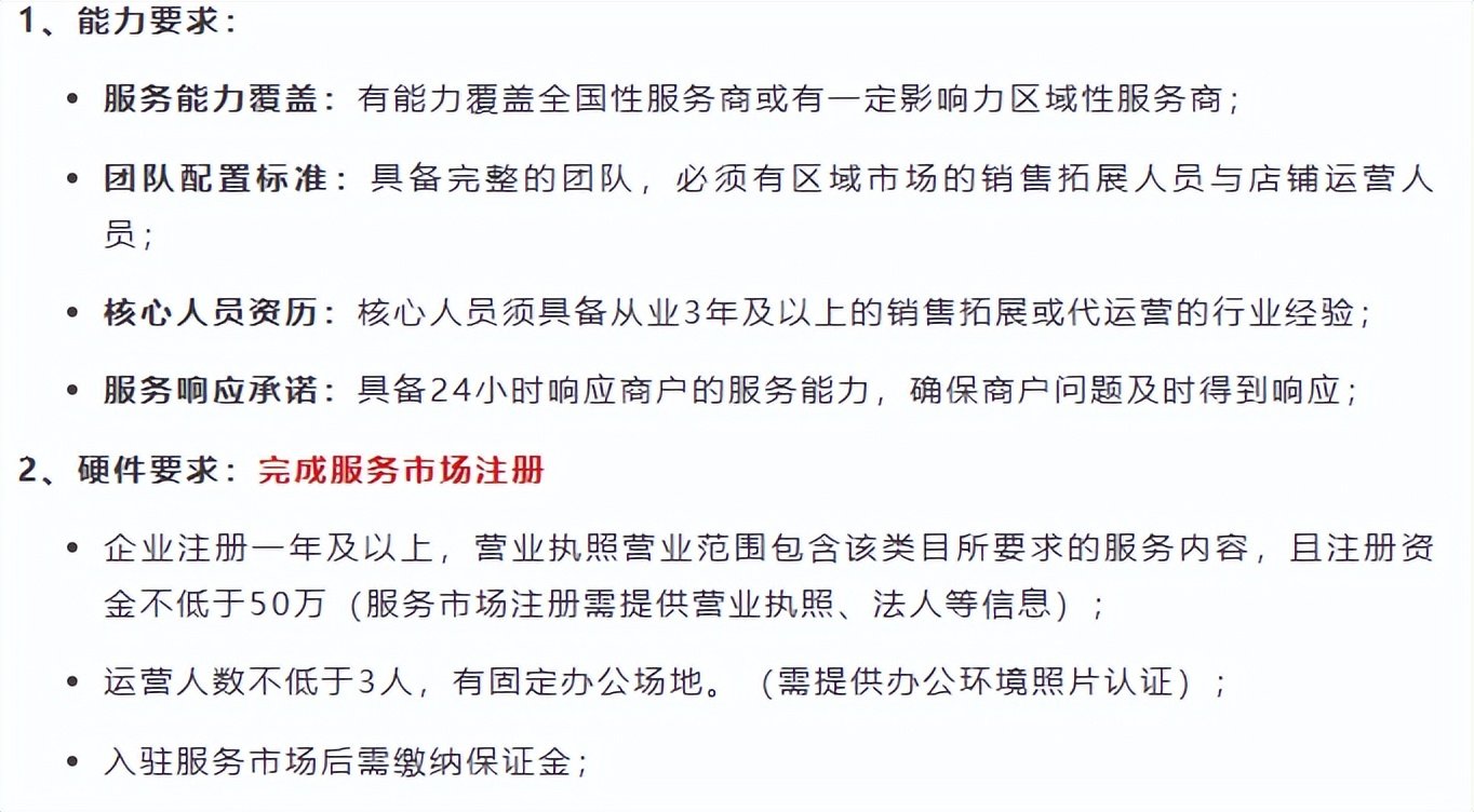 具体而言,这种方式采用的是技术服务商的模式,既不需要你有任何的申请门槛,也不用你在正式签约之后,受到官方规则的约束和定期接受任何的考核,更没有扣除保证金和直接清退等说法。